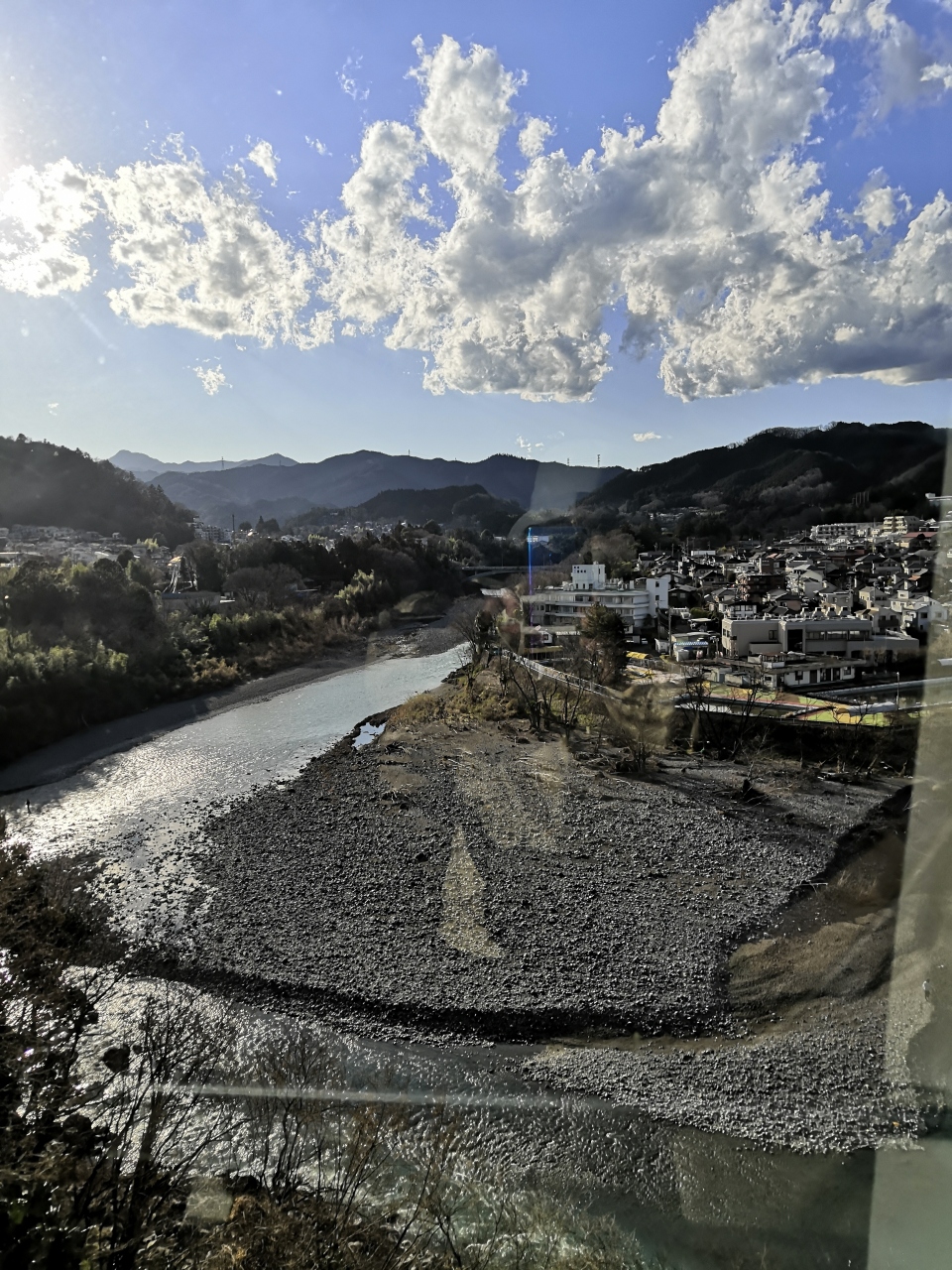 送迎バス利用ですが 街中には車は入らず 橋手前まで歩きます。