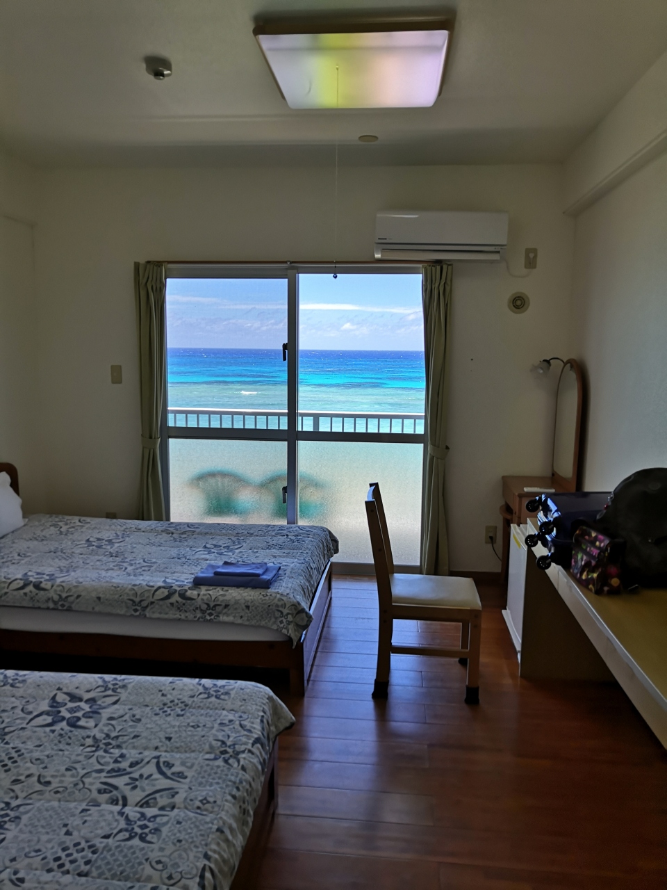 お部屋の窓から ニシバマビーチが見えて 夕日も見える。海目的の人には 最高だ。歩いてすぐにビーチに行ける。宿の人たちは みんな感じが良い。食事も沖縄料理が入り 素朴だけど 美味しい。ゴーヤやパプリカ、ピーマンが 毎日 料理に入っていたが 嫌いなので それは嬉しくはないが。外に2つ シャワーがあるが 1回だけ 巨大なクモがいて びっくり! また、夜になるとヤモリが窓に張り付いていて 3匹もいた。屋上から 満天の星空が見えたのも 凄かった!
