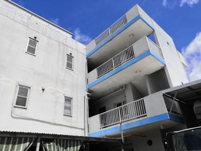 港やバス停も近く 隣にガソリンスタンドとレンタカー 反対の隣はスーパー とても便利な立地だ。 3階建てのマンションの屋上にプレハブ小屋のような形式で 部屋が並んでいる