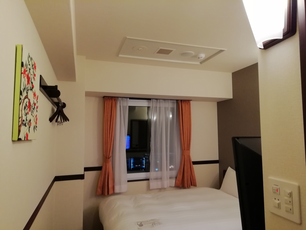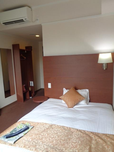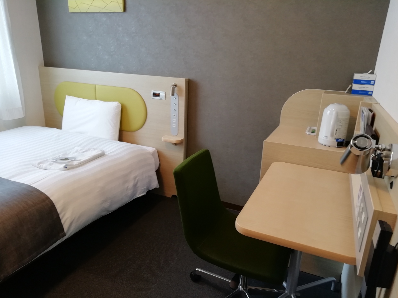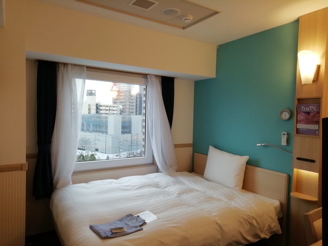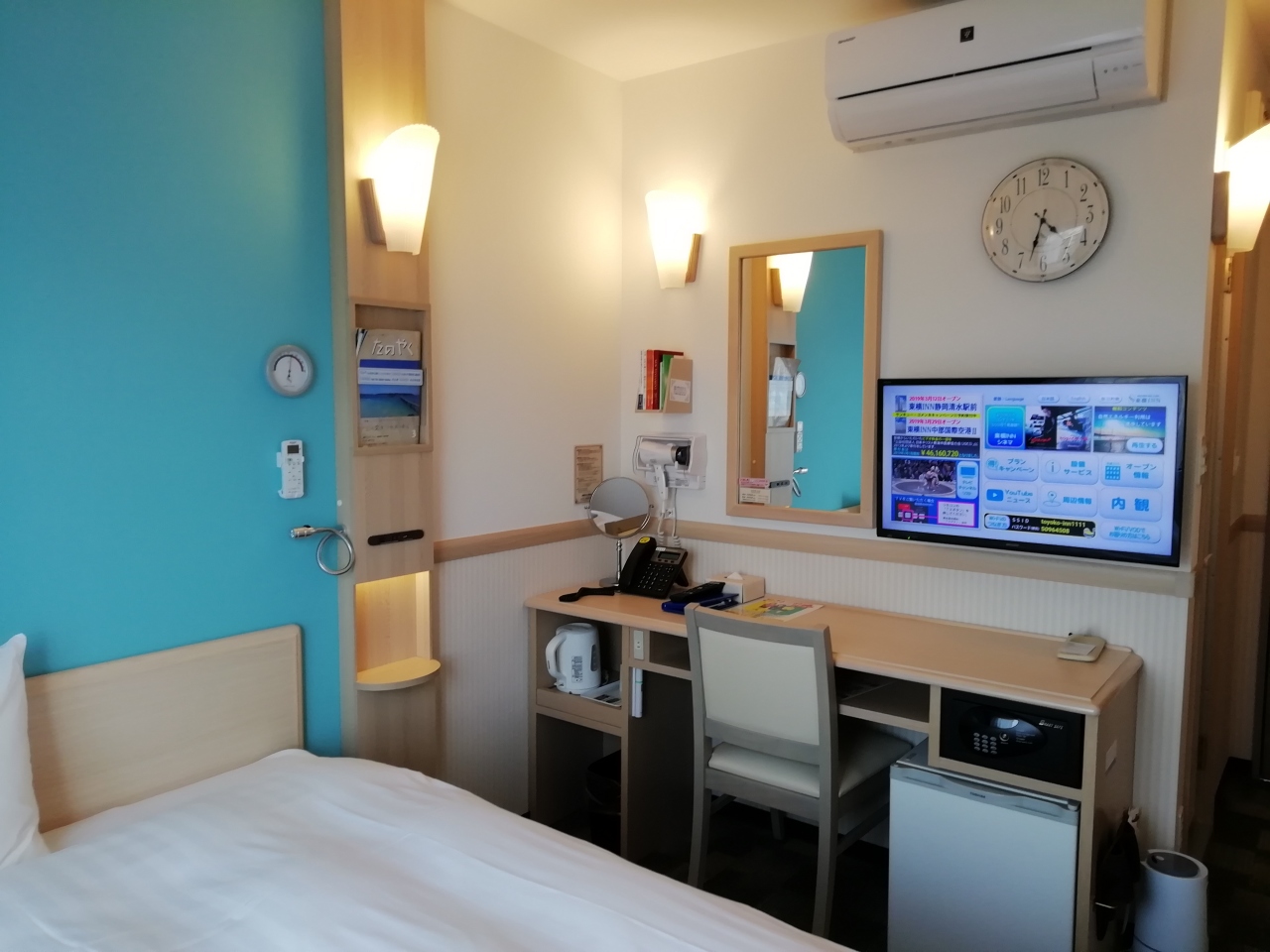 お部屋は 新しいタイプで 壁の色が水色 ベットの枕元にライトとコンセントは便利。