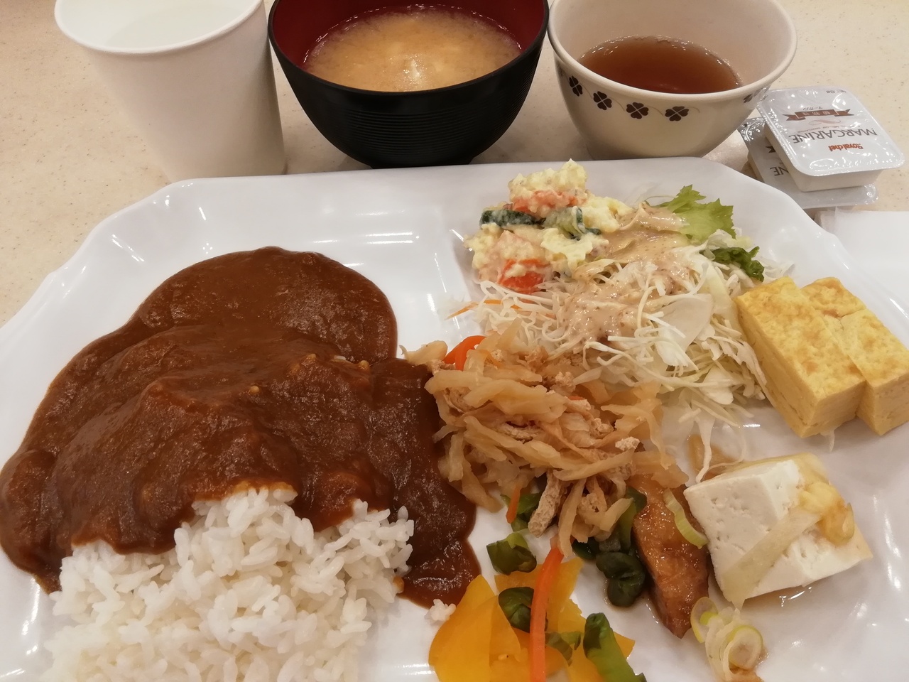 朝食は ご飯とパンがある。飲み物がコーヒーとほうじ茶。