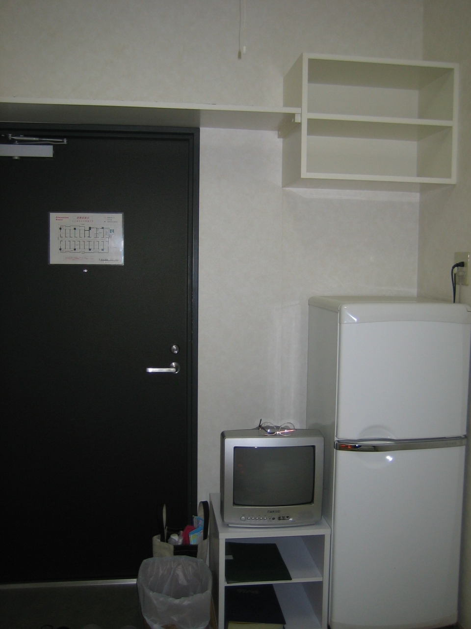 クーラー、テレビ、小さな冷蔵庫に机、鏡もあります。