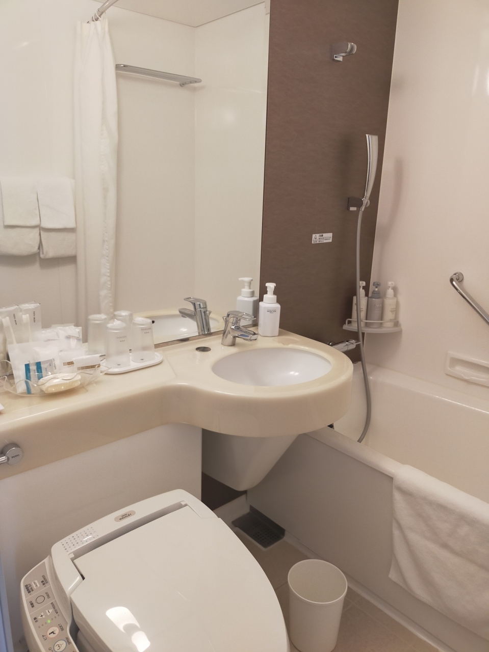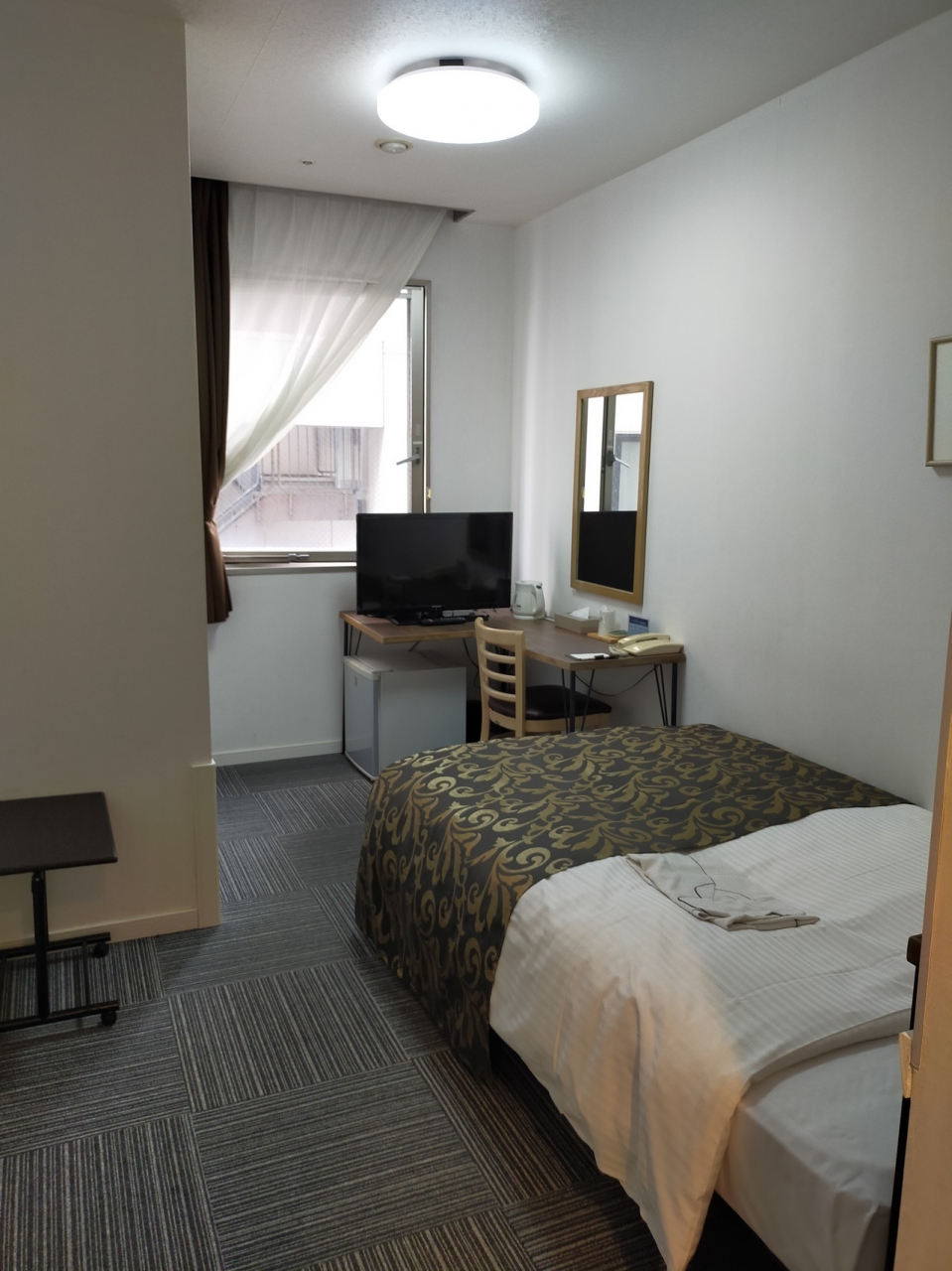 駅から見えるぐらいの近さで 歩いて1分ぐらいです。すぐ隣にスーパーがありその隣が 日帰り入浴の 温泉施設です。 ホテルで 無料入浴券を もらいました。 天然温泉で 10種類くらいの お風呂があります。 部屋には 冷蔵庫がありません。 また バスタブは 足が伸ばせないぐらいの狭さです。 トイレは 旧式の 洗浄で 便座の暖房はありません。 部屋のベッドは セミダブル ぐらいで デスク も広くて使いやすいです。 wi-fi は 遅め、冷蔵庫がないのは多少不便ですが 駅前で このお値段なら 十分 価値があると思います。 朝食は3階の中華料理店 になります。 和食か洋食が選べて お盆になり フリードリンクです。 味も 量も普通です。