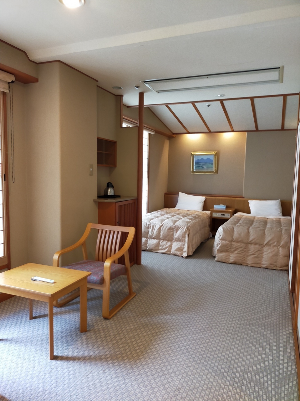 送迎バスで 来ましたが 歩くと14分ぐらいのようです。 路線バスは ホテル前の道を走っていないようです。 電車の本数も少ないため 送迎時間と会わずに どうしようか迷いました。 部屋はとても広かったです。 ツインのベッドルームと 8畳に床の間 その間に 少し空間もあり テーブルと椅子セットがあります。 残念だったのが ティッシュケースの底に 柿の種がたくさん 落ちていたことです。 お風呂は 種類も多くて とても満足でした。 ウェルカムドリンクは コーヒー 紅茶 オレンジジュースがあります。 曇りの日は 気温が低めなので 避暑に良いです。