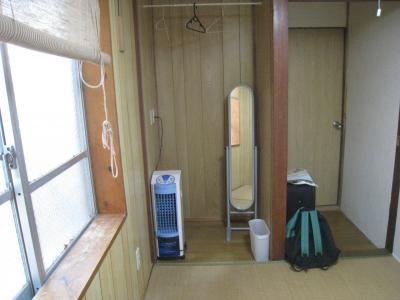 クーラー・テレビ テーブルに洋服入れ 窓の外のテラスには 洗濯が干せます。