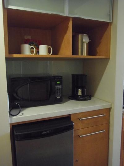 無料で使えるパソコンが 何台か置いてあり その部屋や廊下にいつでも飲めるコーヒーやお茶が 置いてある。