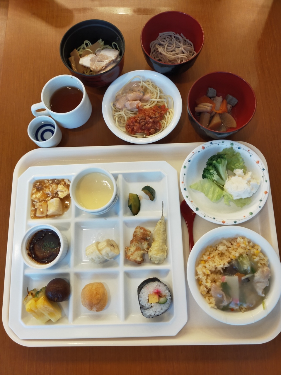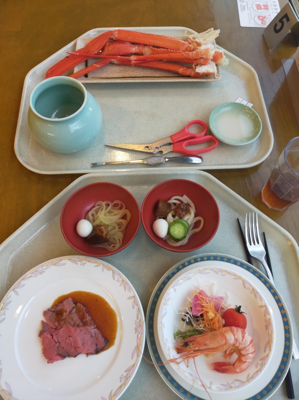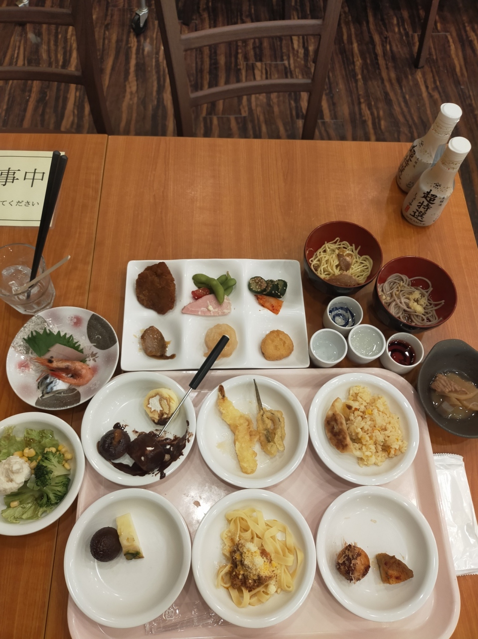 眺望なしの洋室 でしたが 窓は大きめで すぐ壁ではなく空間があります 3方向 を壁 に囲まれているけど 空も見えます。 今回は 問題 いろいろありました。 眺めが悪いのは最初から分かっていたことなので良いのですが まず テーブルに椅子がない ソファー用の椅子だと低すぎて 使えない スーツケースを置くスペースがあまりない。 一番嫌だったのは トイレが臭かったことです。 前回利用した時は それほど 嫌な印象はなかったのですが 今回の部屋はだめでした。 食事は毎日同じメニューで さすがに 3日目ともなると 飽きてきたし 楽しみがありませんでした。しかし、隣の黄金の湯は良かったです。 昔はシアターもあったけど 無くなっていました。