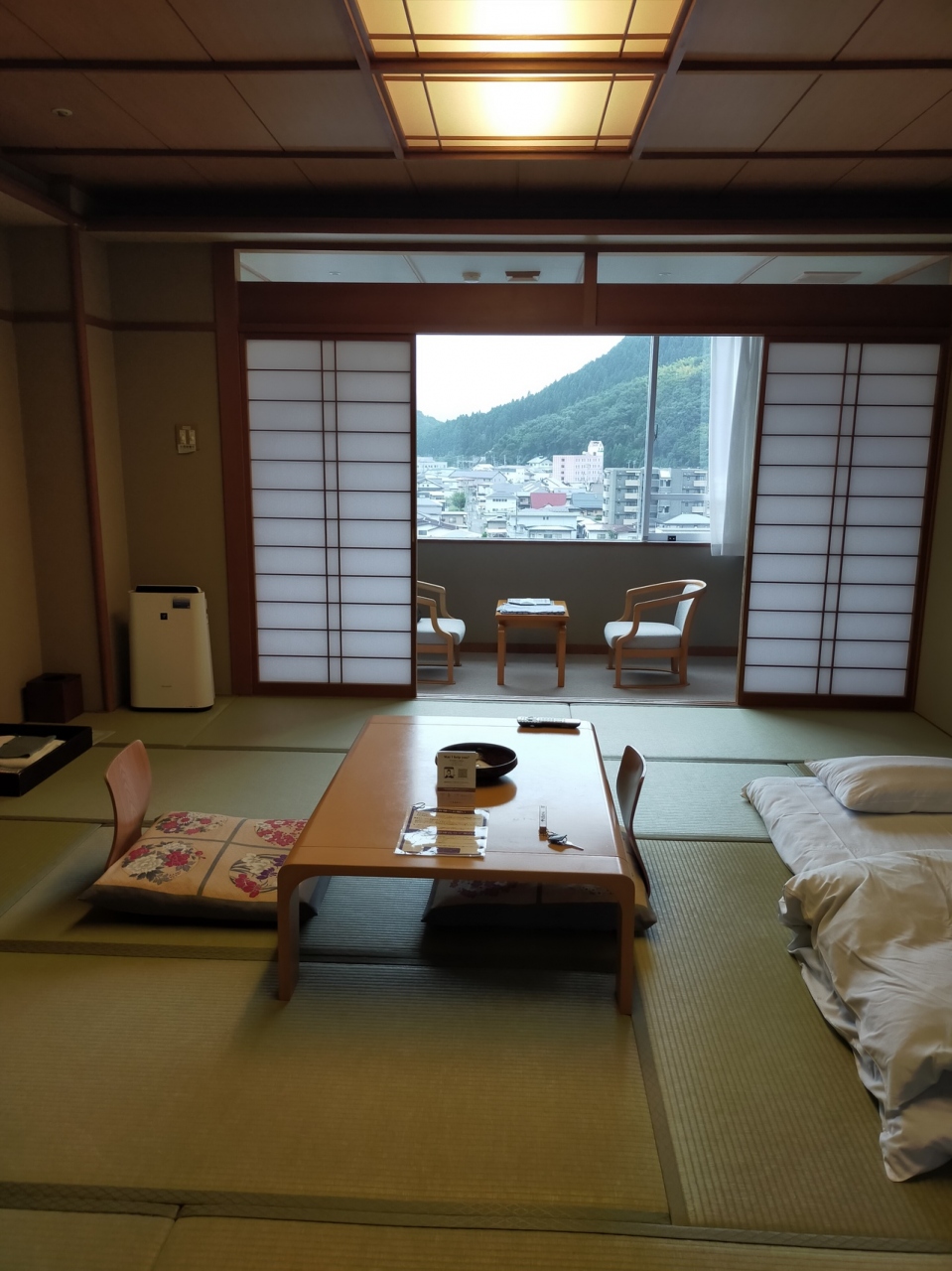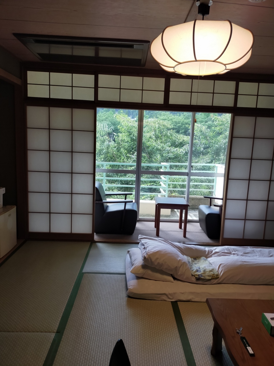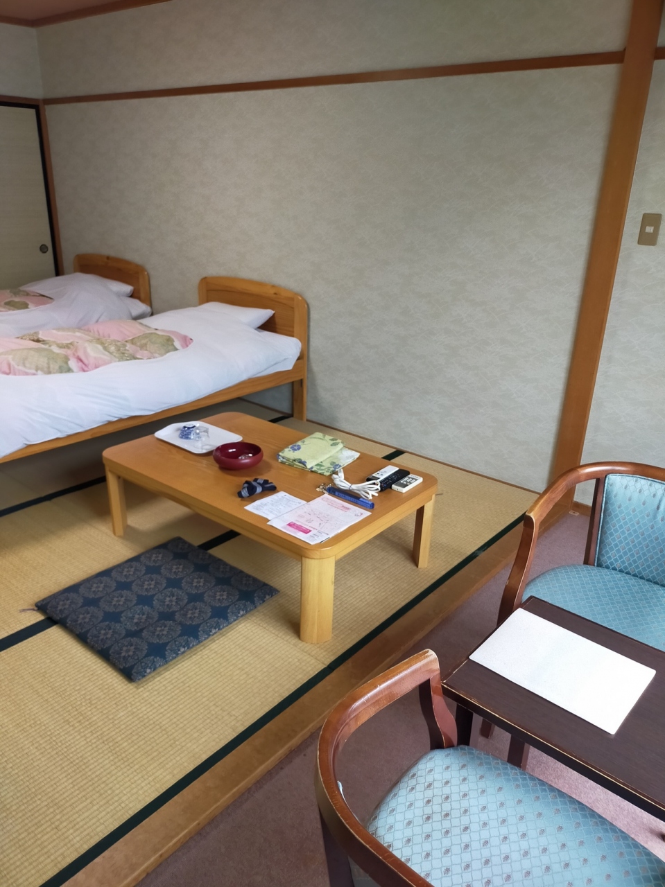 小山から無料送迎バスに乗って 塩原温泉のホテルおおるり に行きました。 マイクロバスは小さめです。 部屋は本館6階建ての5階でした。 ビジネスホテルと違って 玄関も広くて 洗面台は 廊下にあり それとは別に トイレとユニットバスがあります。 洗面台の隣に 冷蔵庫があり 使いやすかったです。 部屋は和室10畳にベッドが2台あります。 広縁に テーブルと椅子のセットもあります。 テレビは 33型ぐらいでしょうか。 wi-fi は ストレスなく よく入りました。 テレビ台などハゲているところはあるけど 部屋はまあまあ 綺麗でした。