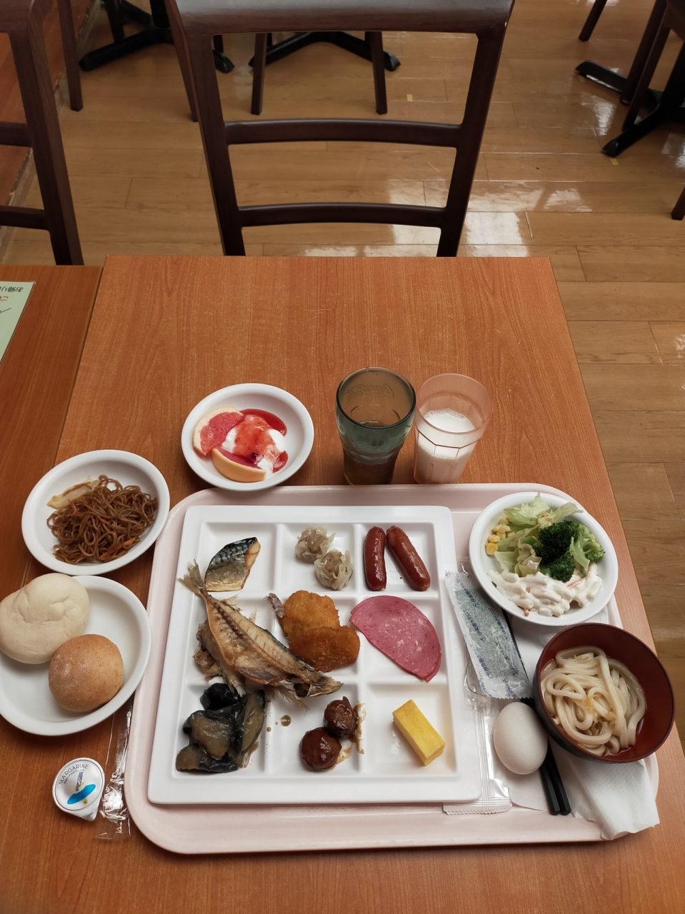 前に盛岡の東横インを利用したことがあるが ここの 東横インは初めて でした。 驚いたことに 改良点があり まずずっと欲しかった 折りたたみ式のスーツケース置き場が あったこと そして ベッドサイドの 机側には1つコンセントがありますが 窓側の方にも 延長コードが 固定されていて コンセント2口と USB と C タイプが接続できるようになっていました。 利用した部屋は最上階で 川と橋がよく見え 景色が良かったです。 ベッドも広くて ゆっくり眠れました。 さらに バスタブも広く 座って 足先 20cm 以上あったと思います。アメニティは フロントの 隣に置いてあり パジャマはエレベーター前にあります。 氷と水も パジャマの隣にあります。 テレビの大きさも まあまあの 普通サイズです。 朝食も良かったです。部屋で食べれるように容器も置いてあります。東横 INN が 個別の エアコンなので 温度調節ができて快適です。 10月に入っても まだまだ暑く 今日は 25度ありました。 ここのホテルは使いやすかったです。唯一、エレベーターが一台なので 朝は時間がかかり 4~5分かかりました。