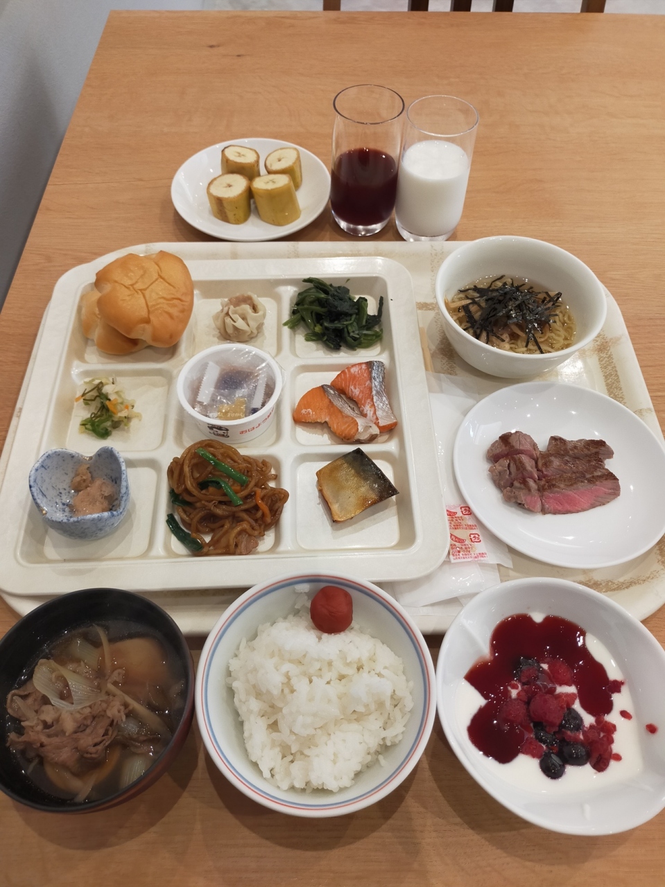 朝食は朝からその場で焼いてくれるステーキが 3切れ それと冷やしラーメンも作ってくれます トッピングは自分でします。 どちらも美味しかったです。 種類も豊富で 満足できる朝食の内容でした。