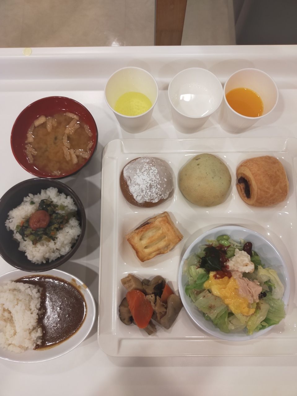 りんごジュースとカルピスと お茶です。 朝食は良かったです。 ミニサイズの牛乳と ヤクルトもありました。 敷地内ににパン屋さんもあるようです。 またバラ園も近いようです。 フロントに3部咲きと書いてありました。