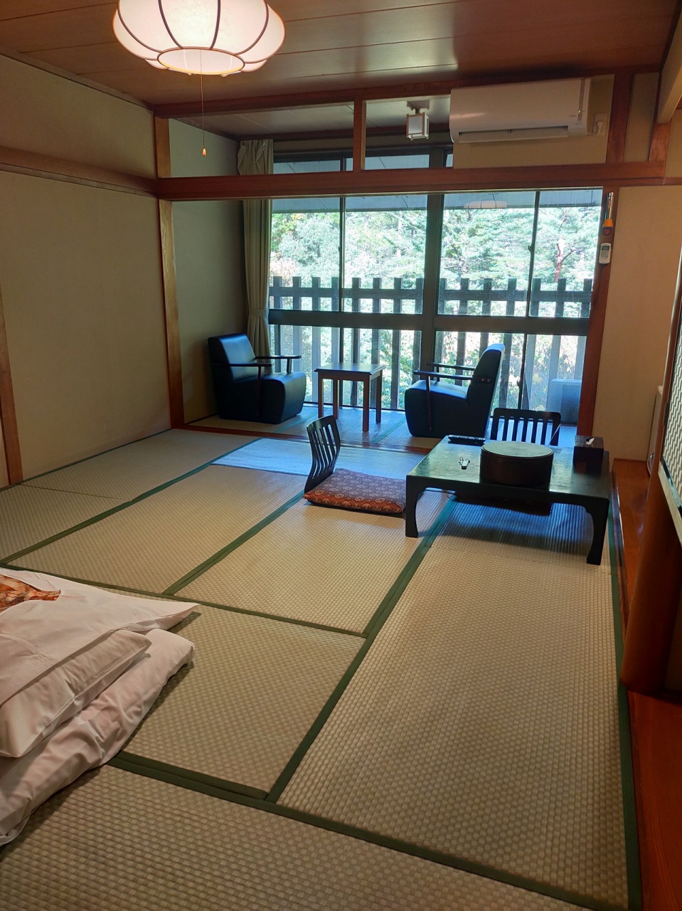 部屋は 10畳に広縁がついています。 そこにお湯が出る洗面台 もあります。 部屋には 冷蔵庫と湯沸かしポットが 置いてあり 個別の エアコンがあります。 テレビの大きさは 普通です。 部屋からの景色は 木に覆われて よく見えないけど下に川が流れています。 予約が必要ですが カラオケ 50分 貸切風呂 30分が利用できます。 貸切風呂は1つしかないので 仕方がないのですが 30分は短かったです。 最初から 布団が敷いてあります。 連泊してもお掃除はないようです。 タオルなどの交換品はドアノブにかけてくれています。 wi-fi は ストレスなく使えました。 食事は美味しかったです。 野菜の煮物などが出て ヘルシーでした。 予約していたカラオケが 音が出なくて 時間の無駄 が出てしまいました。 その前に 掃除の時間が入っていたのですが ちゃんとチェックしていなかったのかな と思いました。 それと 半纏のポケットにティッシュが入っていて それも確認不足です。 また 休憩所の椅子の上に 使用済みのマスクが ずっと放置されていました。 人手が足りないのかと思いました。 サービス面では行き届いてないと思いましたが コストを 下げるためには 仕方がないかもしれません。 お部屋や 食事 お風呂も満足できました。 広い露天風呂が気持ち良かったです また温度も 熱くないので 入りやすかったです。