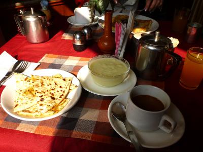 朝食はセットメニューか単品か選べ、私は3日間ともセットメニューにし、インディアン式とチベット式の朝食をとりました。なかなか美味しかったですが、ちょっともの足りなかった。- 旅行時期