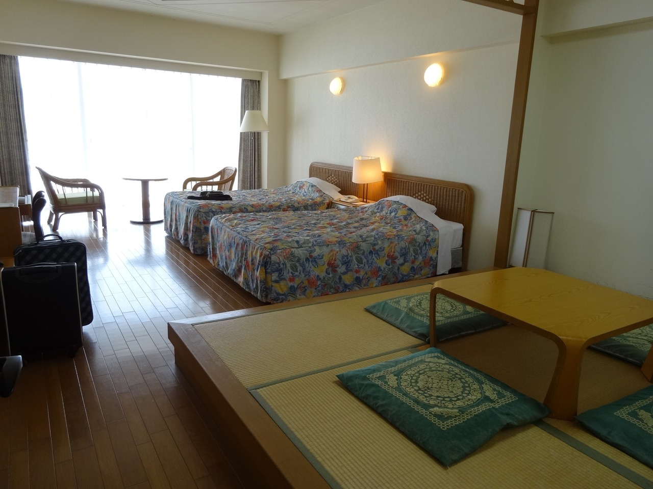 ホテルの1Fのフロント、レストランはとてもキレイで居心地良かった。でもお部屋がある8Fのエレベーターを降りて、部屋にむかうと建物の古さが際立って見えた。部屋はミニキッチン付きのツインベッド、畳のスペースもあり家族で過ごすのには特に良さそう。