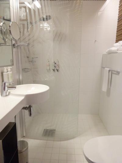 - シャワーのみでバスタブなし。水よけの壁があるだけなので、水しぶきがはねる