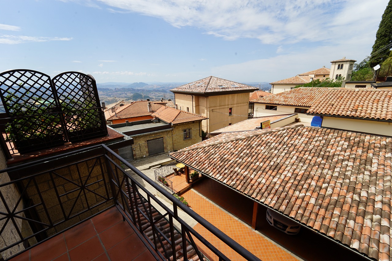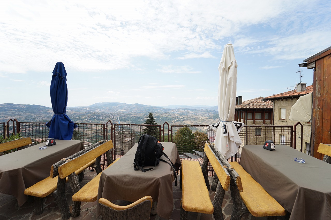 部屋から外を見て遮るものがない。窓の外、目下に屋根や市街地が見える。窓の大半には青空が広がって見える。