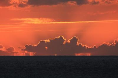 海を見ながら夕陽を見ていると、 夕日を横切るように飛行機が降りてきます。