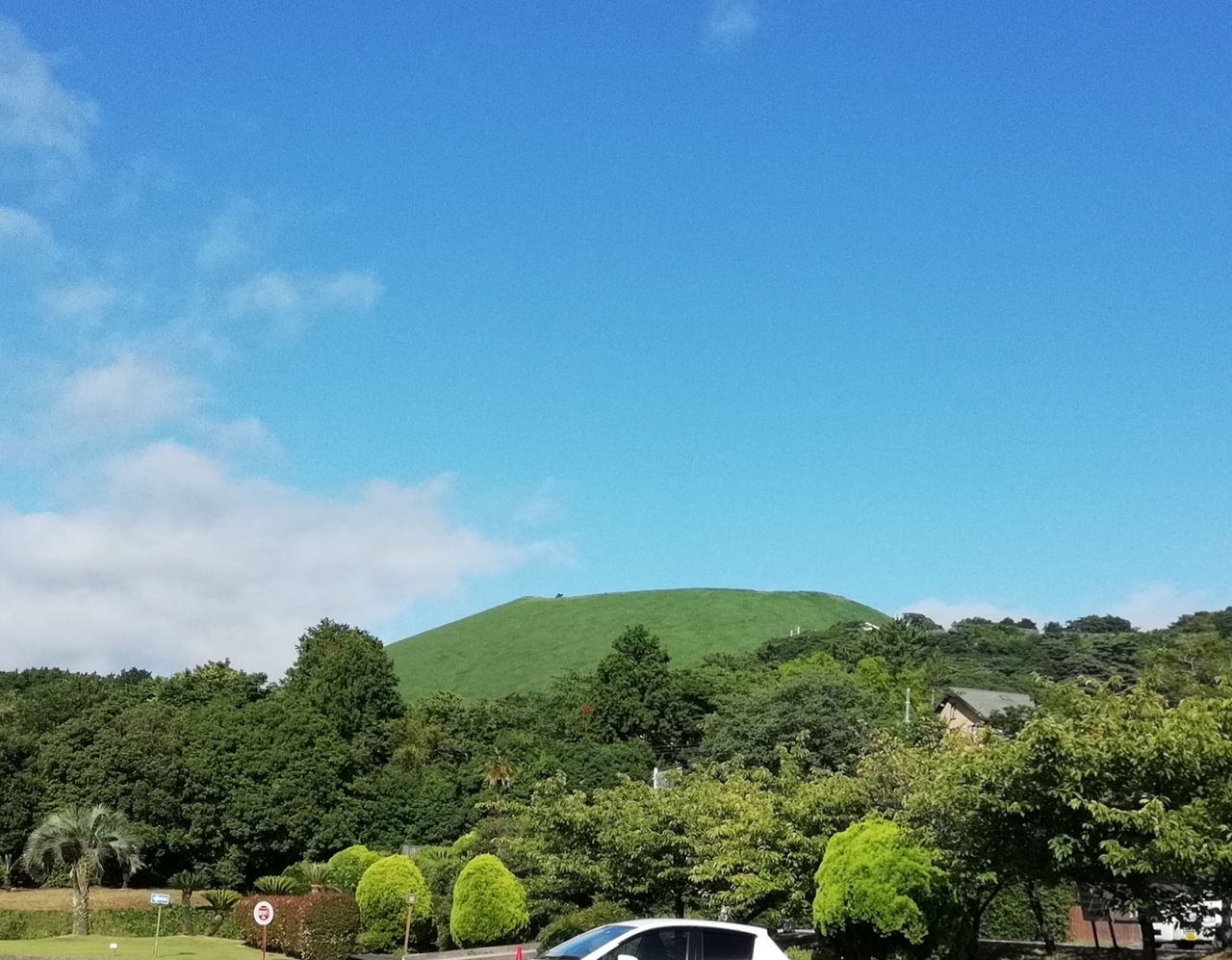 標高580mの山頂に直径300mのすり鉢状の噴火口をもつ休火山です。