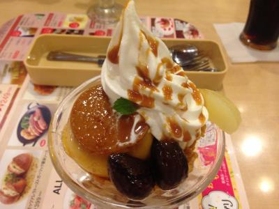 秋のフェアメニューでやってる渋皮栗と洋梨の自家製かぼちゃプリンサンデーを食べました。