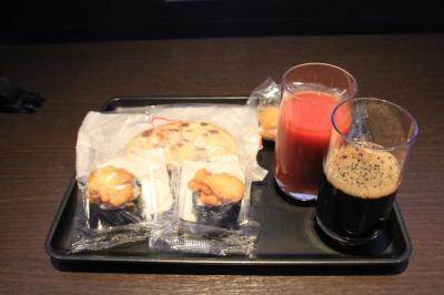 朝は 羽田空港へたどり着くだけで精一杯 だったのでご飯を食べる余裕もなく、 とりあえず ラウンジへ駆け込んでおにぎりとパンで朝食としました。