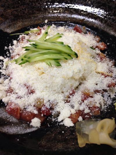 ここの名物は、「粉雪チーズちらし」です。まぐろ、サーモン、いかの具がのせられています。その上に富良野ホワイトチーズを粉雪風に散らしてあります。