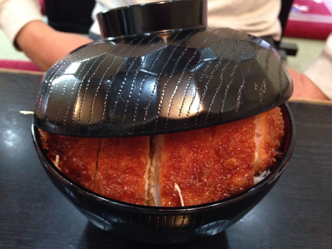 私たちは信州豚ソースカツ丼(1340円)にしました。ご飯の量は大盛りプラス100円、少なめはマイナス50円です。