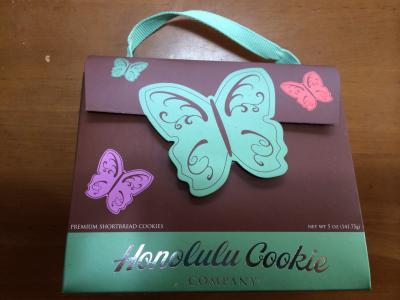 今はワイキキを歩くとあちらこちらにホノルルクッキーカンパニーが。美味しいからいいけど、ちょっと飽きてきたかな?そこで同じホノルルクッキーカンパニーのクッキーだけどニーマンマーカスにて購入。ここで買うとパイナップルの形ではなく蝶々の形のクッキーです。ちょっと違う感じでいいと思います