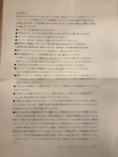 息子がコミケに行くために宿泊した有明ベイワシントンホテル。ビックサイトに近いというのだけが魅力かな。コミケ期間中はセキュリティ対策でホテル入館時にカードキーを見せないと入館できません。部屋は古さはしょうがないのかな?タオルも薄ーい感じのものでアメニティも最低限のもののみでした。