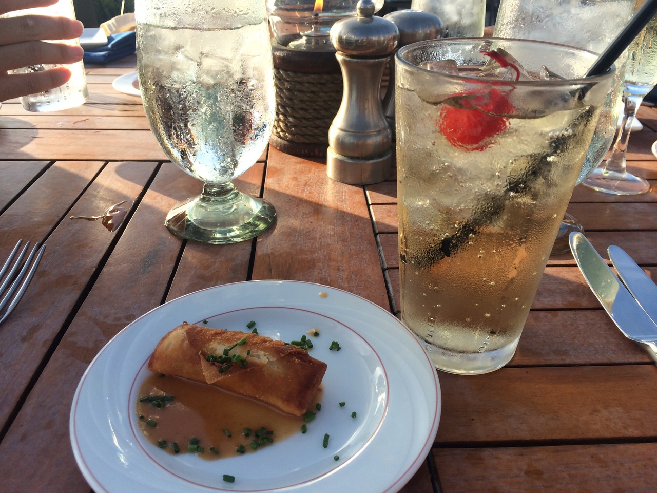 17時30分で夕陽が綺麗に見える席確定の予約をしました。1人25ドルかかります。その中には春巻みたいな前菜とシャンパンがつきます。