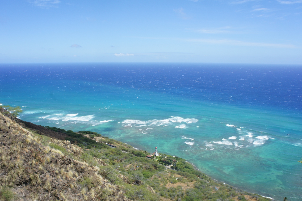 料金を払ってダイヤモンドヘッドに登ります。途中(コースの3~4分の1くらい)までは舗装されているので車椅子やベビーカーも可能です。まだまだ先だなあと思いながらも周りの景色を見ながら登るのは気持ちがいいです。最後の急階段が目の前にきた時には息を呑みましたが、下っている人が「この階段を登るとすごく綺麗だからがんばって」と声をかけてくれたので登りました。