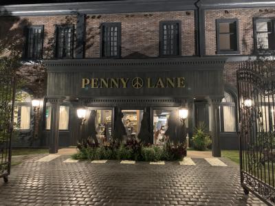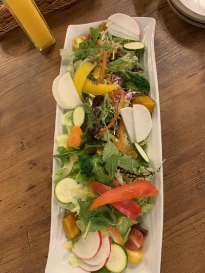 レストランペニーレインに行きました。夜はライトアップされて素敵。サラダやアヒージョの野菜がおいしい。無料のパンはおかわりできます。美味しいからおかわりしたかったけどお料理のボリュームが多いからおかわりは残念。ラストオーダーが21時なのもいいです。
