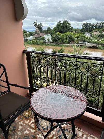ピン川ぞいにあるピン川に面したホテルです。別のホテルを探していて,たまたまチト値がはりそうなエキゾチックな建物ををみかけたので,入ってみました。するとリバービュー朝食付で1000TBHと。 内覧して即決定しました。朝食は2種からの選択。ブフェ形式ではありません。