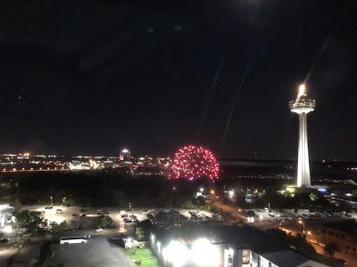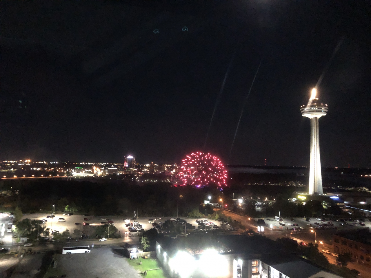 部屋から,一杯やりながら花火もきれいに見えました。ホテルのカフェ兼売店ではメープルシロップは購入しない方がいいです。2泊しました。どのホテルでも価格は上がりますがフォールズビューの部屋をオススメします。- 旅行時期