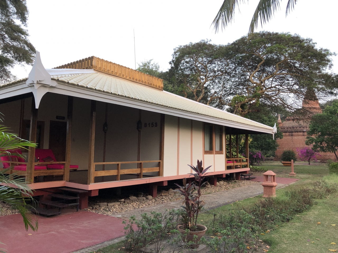 パガン ニャウンウー空港から15分程。ロッジタイプで上がり口にバルコニーがあり,ソファーベッドが配置してあるので,入浴後まったりとビールなど,,,気持ちよく居眠りさせてもらいました。敷地内に遺跡があったりします。このタイプは「離れ感」があって良いのですが,その分歩くことになります。遺跡観光のあと,ゆったりと過ごせました。