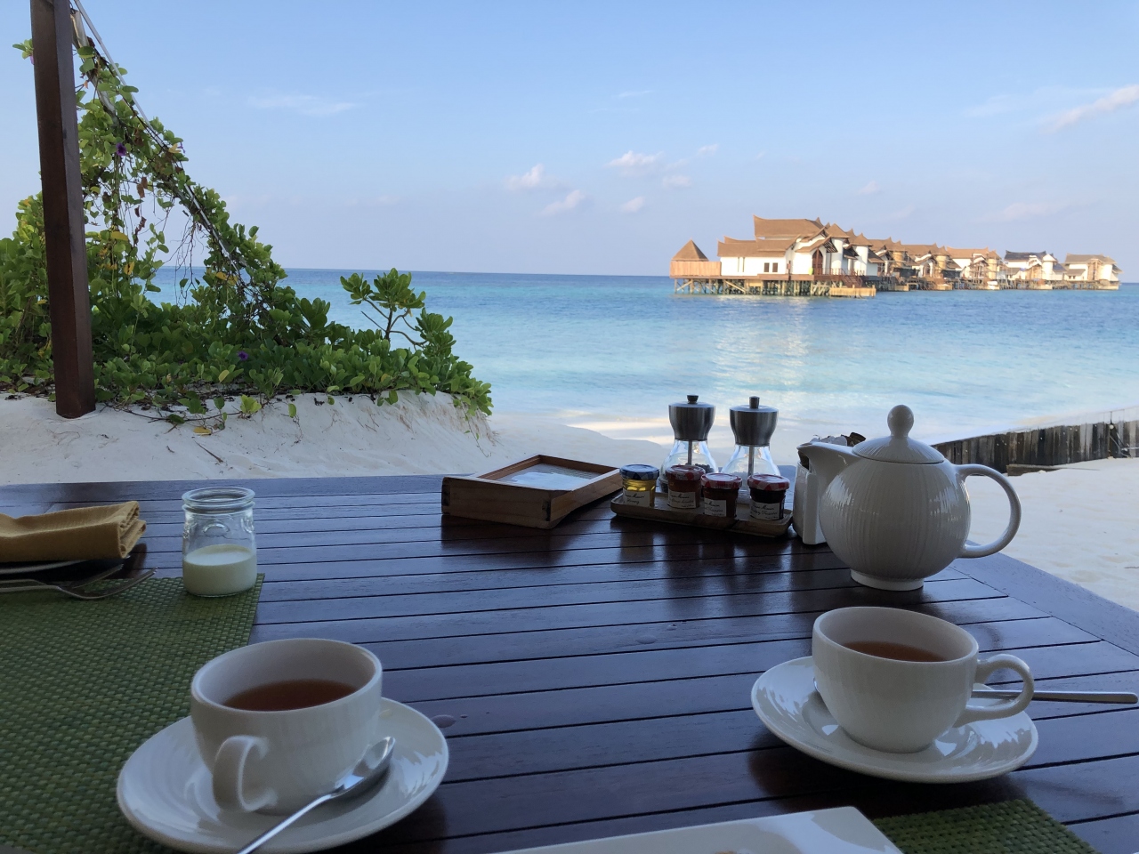 レストランでは毎朝、浜辺のテーブルでご飯をいただきました。