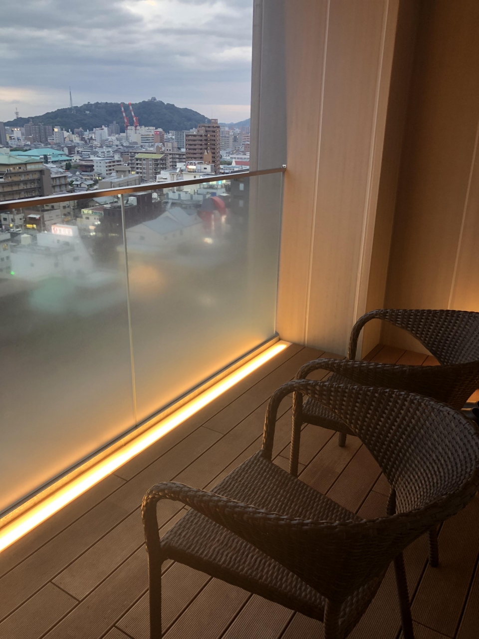 道後温泉は旅館やホテルが立ち並び、露天風呂付でも狭く囲われたところのことが多いのですが、こちらは道後温泉の街並みを見下ろすバルコニーに設置されたお風呂で、目隠しも上手にありながらも、空とちょっと雑多な街を眺めながら温泉を楽しむことができます。