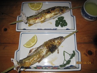5月下旬から9月中旬ごろまでは 玖珠川の鮎の塩焼きがうまい 特に 真子をもった9月ごろは食べごろ