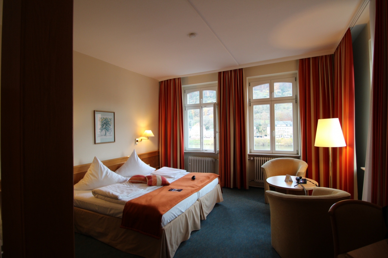 ハイデルベルクの旧市街、カールテオドール橋が目の前で観光に便利な立地。駅からはタクシーで10ユーロほど。泊まった部屋は最上階の角部屋でネッカー川とカールテオドール橋の眺めがよく、もう一方の窓からはハイデルベルク城も眺められ眺望は最高でした。部屋の広さも十分でバスルームはバスタブも大きくゆったりくつろげます。