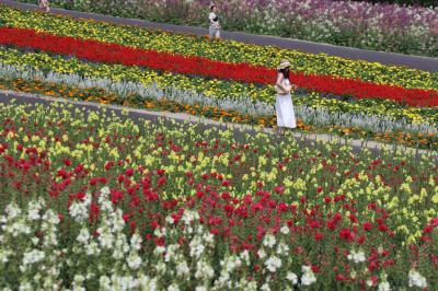手前がキンギョソウ、歩道を挟んで向こうがペチュニアの畑です。園内の歩道...