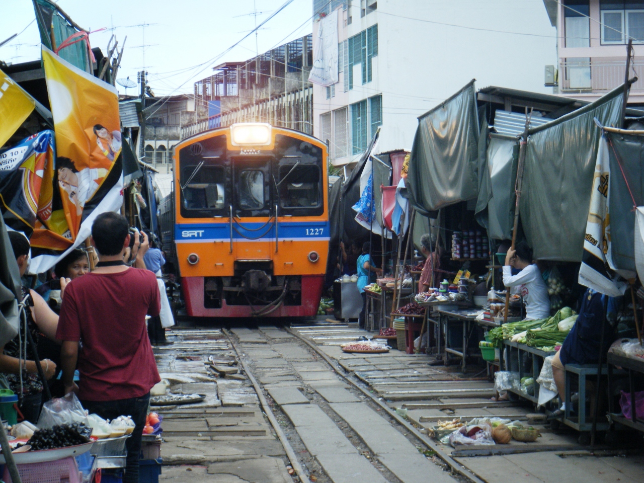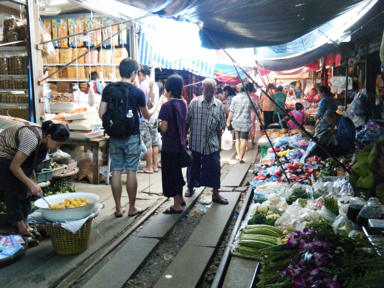 線路の上に市場があり、列車がやってくると日よけ代わりに張ってあるテントを一斉に折りたたみ、市場の真ん中を列車が通っていくという珍しい市場。