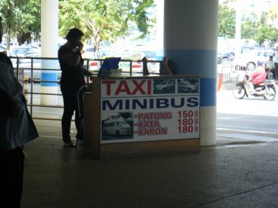 チケットの売り場は、国内線の到着ロビーと建物を出た写真の場所です。料金は、パトン150THB、カタ、カロン180THBです。ミニバスといっても10人乗りのワゴン車で席が埋まると出発です。飛行機到着時たくさんの人が利用しますので、すぐに席は埋まり出発です。