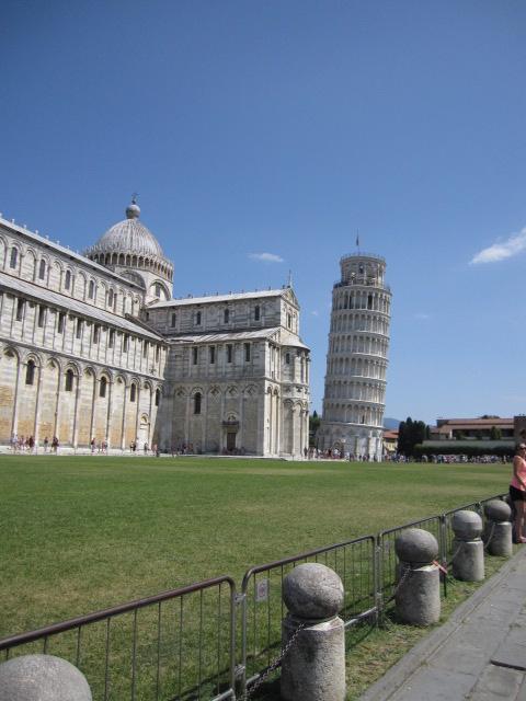 到着し、塀?を抜けるとすぐピサの斜塔が見えます。最初に見たときは感動!「お~!傾いてる!」といった感じです。土産屋はたくさんありますが、レストランは近場にはないので、食べていく方がいいかもしれません。田舎の町にある感じで、癒されました。