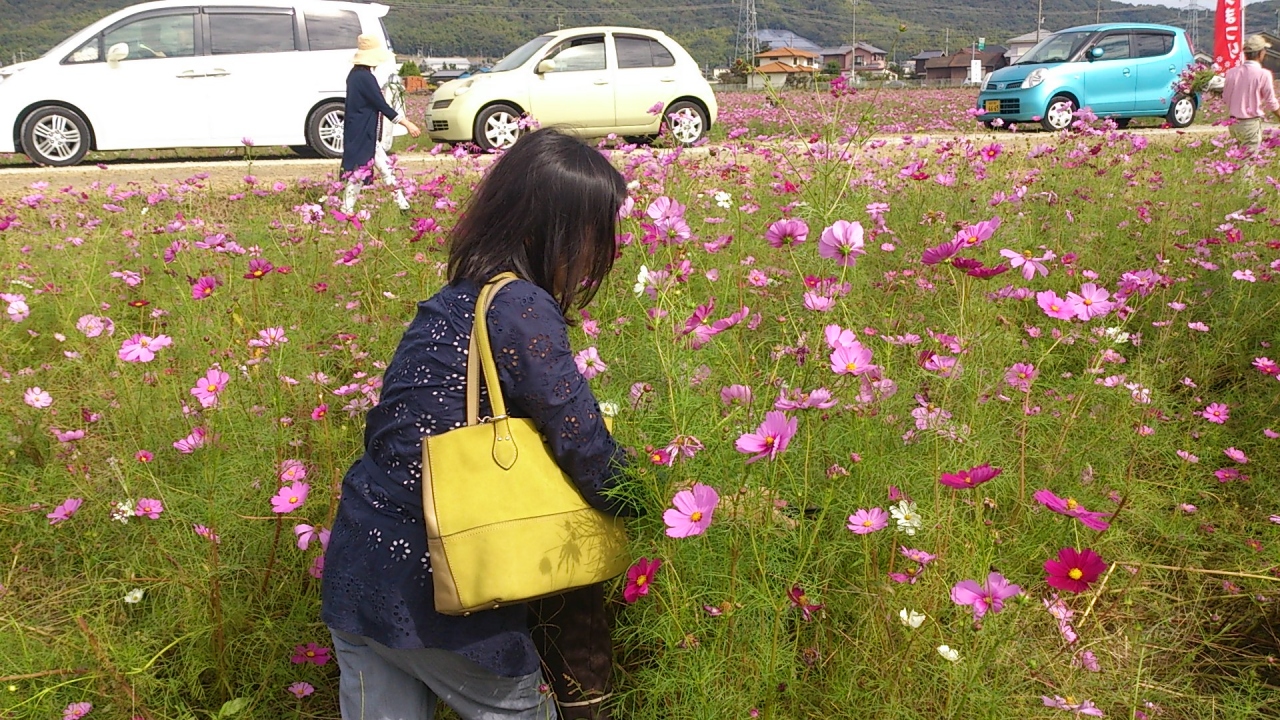 山陽自動車道を利用すれば、加古川北ICから数分で大沢会場のコスモス畑が右手に見えますが、県道43号線からは車1台分の幅の農道を進んでコスモス畑に進みます。見通しが良いので対向車の確認は容易です。ただ、駐車場が見当たらず、他の数台の車と同様、車2台分の幅の農道を見つけて駐車しましたが、案内や管理の人はおらず、あとから来た2台の車が、幅の狭い農道で道を塞ぐように駐車していました(この会場には20人程度しか見物客はいなかったので、注意してもめるより放置でまあいいかと)。10月16日に行きましたが、コスモスはちょうど満開で、爽やかな秋の風が吹き抜け、コスモス畑の中を自由に散策し、秋を満喫できました。