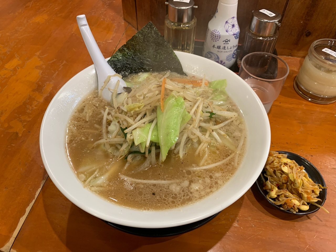 郡山の街道沿いにあるラーメンショップです。一人で夕食を摂りました。野菜が400g入っているという野菜たっぷりラーメン(890円)をお願いします。豆もやしのキムチがサービスでいただけます。現れたラーメン、さすがに野菜がど迫力。夜にラーメンを食べる罪悪感が少し薄まった気がします(笑)。