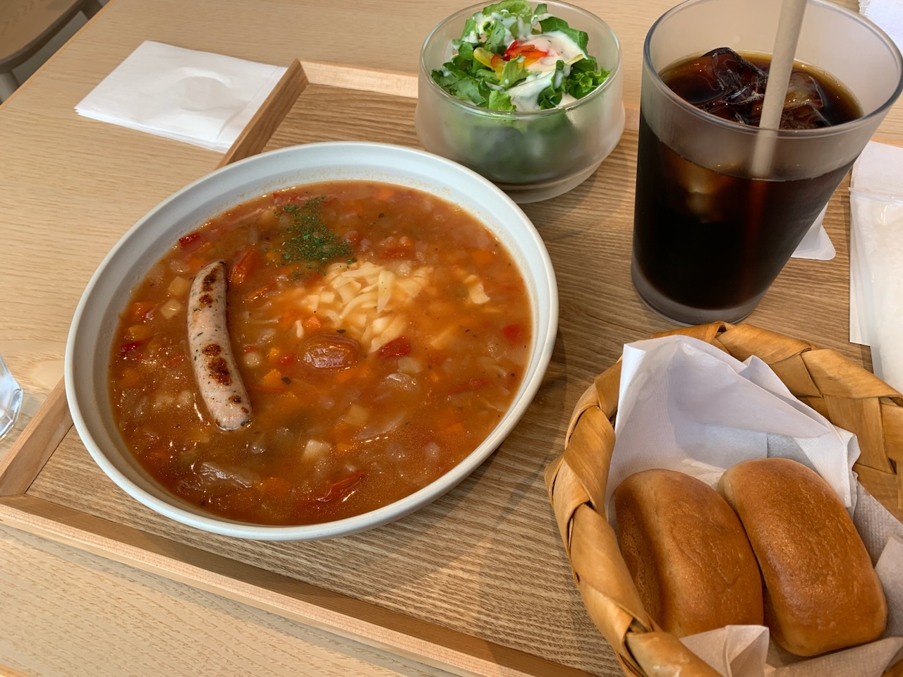 Fビレッジにあるクボタの農業体験施設アグリフロント。その一階にはカフェがあります。エスコンフィールド北海道の中の飲食店は大混雑ですが、ここは穴場。すんなり座れました。ミネストローネのセットをいただきました。野菜たっぷりのメニューが嬉しいです。友人の食べていたサラダセットも大変なボリュームでした。