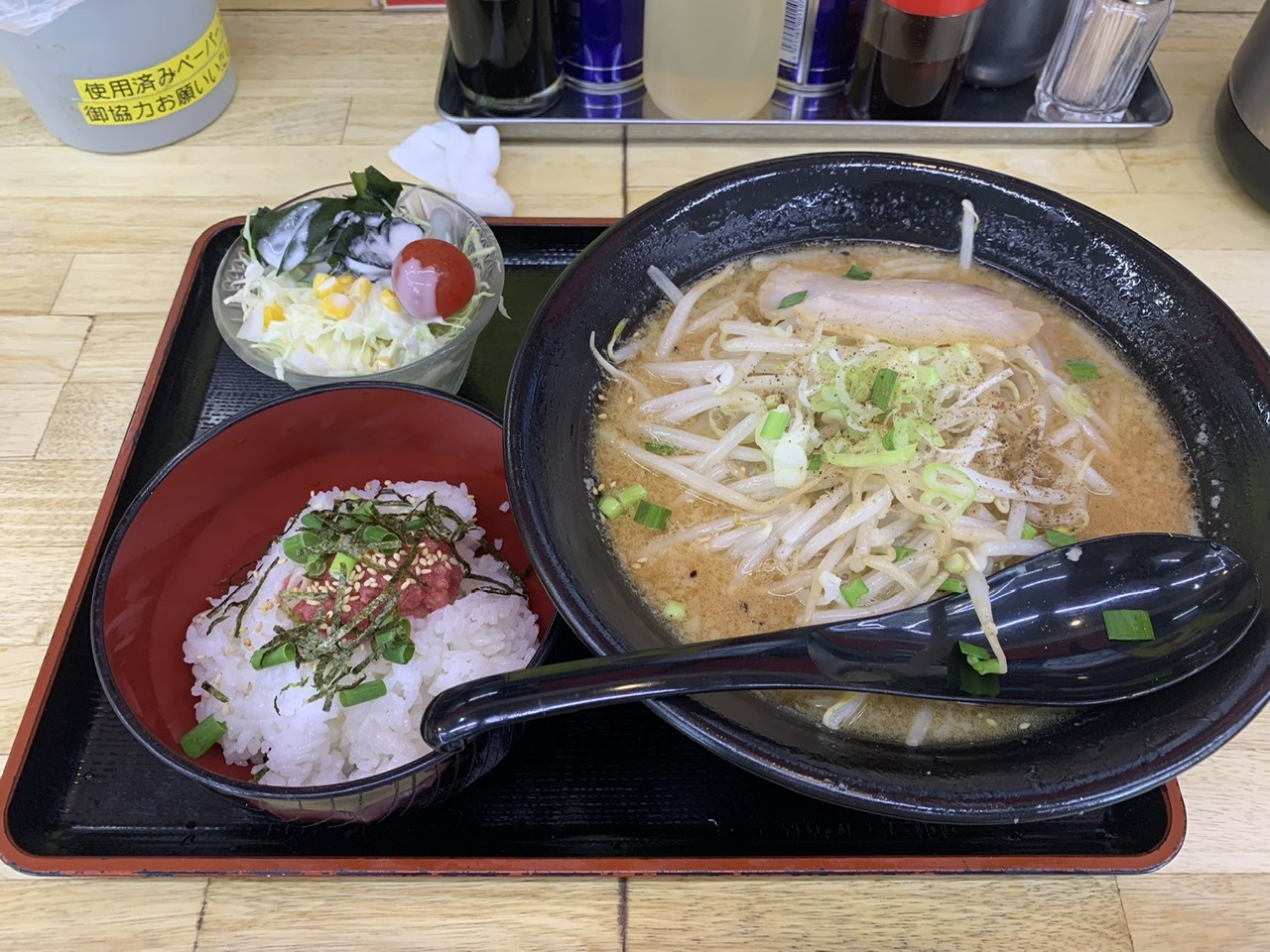 いわき中央警察署の前にあるラーメン屋です。署に遺失物を取りに行ったついでにこちらでランチです。ラーメンのランチセットをいただきました。こってりした味の濃いラーメンに明太ご飯とサラダがついてきます。相当なボリュームです。