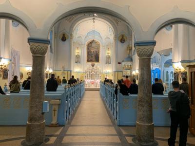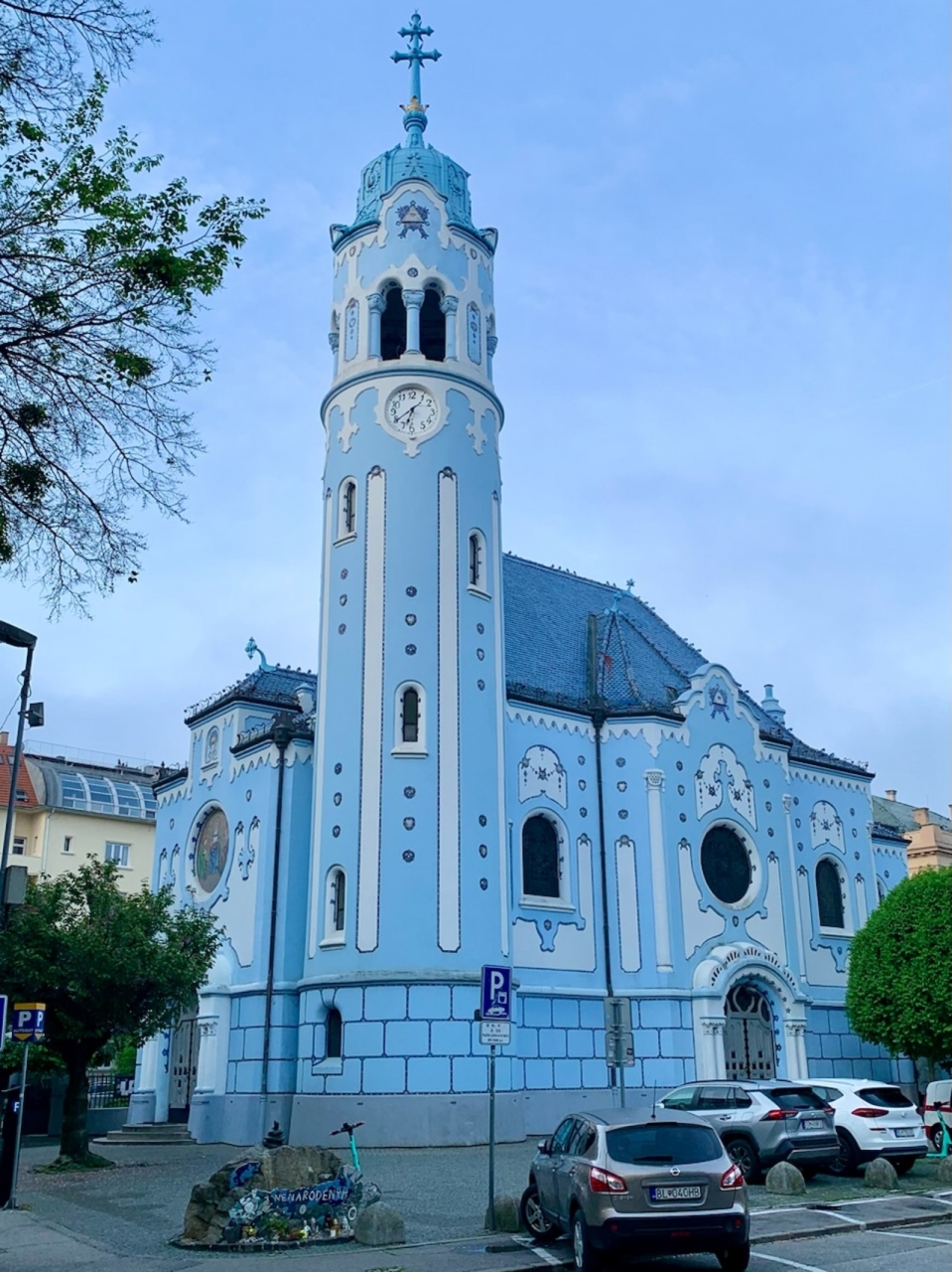 宿泊したホテルのほんの50mほどの距離にあった教会です。通称通りパステルカラーの青い教会で、カーヴを生かしたアール・ヌーヴォー様式がかわいらしく美しい。内部もミサの最中に覗かせていただきましたが、やはり青と黄色のパステルカラーが写真映えしました。
