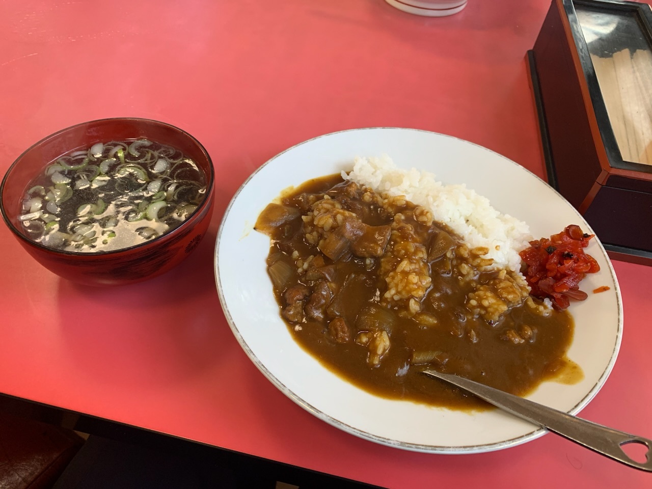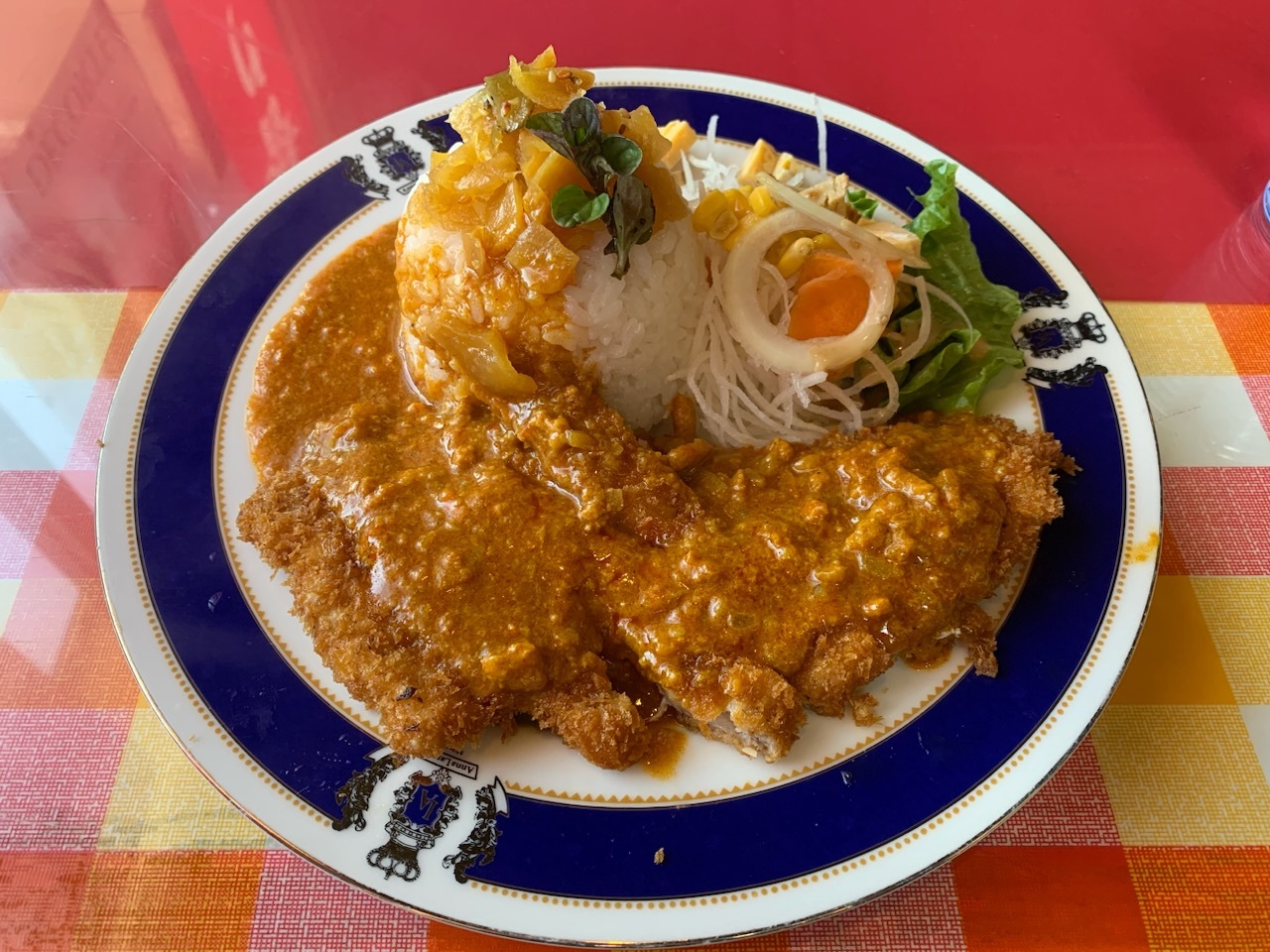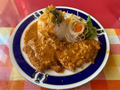 何もない道路を走っていると忽然と現れる大きなレストラン。夜はカラオケバーとして営業しているようですが、ランチをいただけます。カツカレーをお願いすると、思わぬ美意識の高い一品が現れました。奥様らしき女性も妖艶な方で、しかも親切でした。