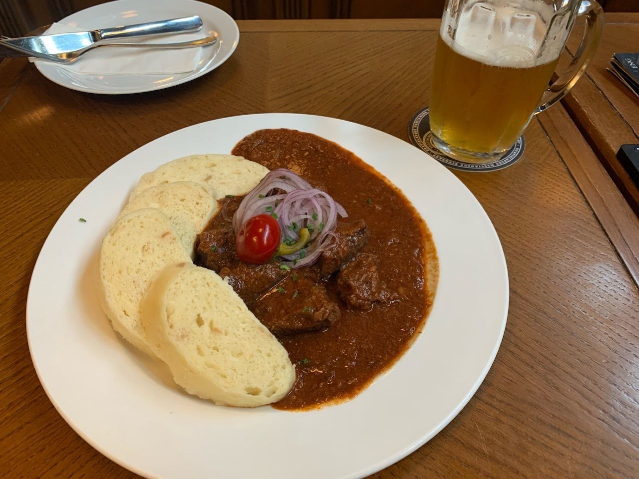 ホテルの近くにあるので、夕食はここで。ビールの醸造場を兼ねているので、飲まない手はないですね。グラーシュをいただきました。ハンガリー式のスープとは違い、煮込んだ肉料理です。クネドリーキが付いていて、分離した今もチェコと文化的に近いんだと思いました。店員さんはみんな親切です。