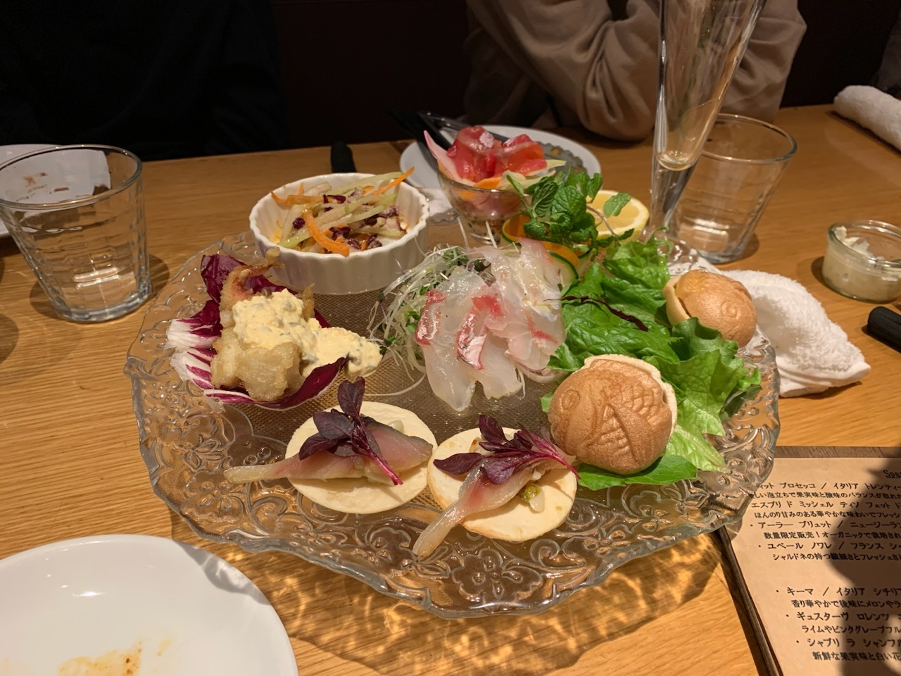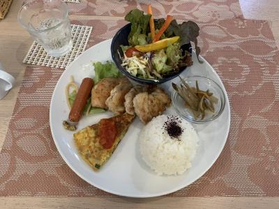 ランチプレートをいただきました。チキン、ソーセージ、キッシュ、サラダなどが一枚の皿に載っています。お味は普通かな。- 旅行時期